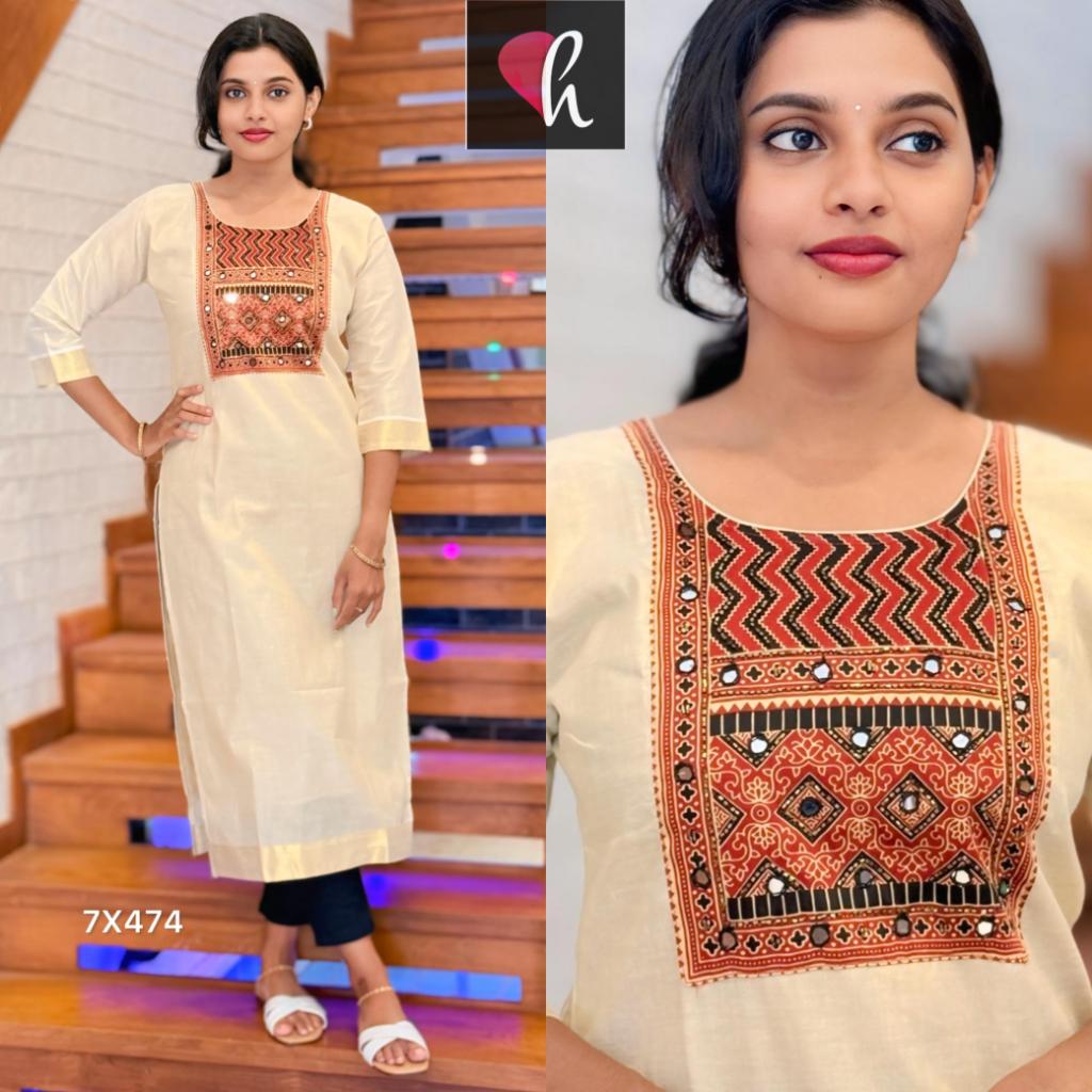 Tissue fabrics Ajrak print patch work with mirror n handwork design slit Kurti