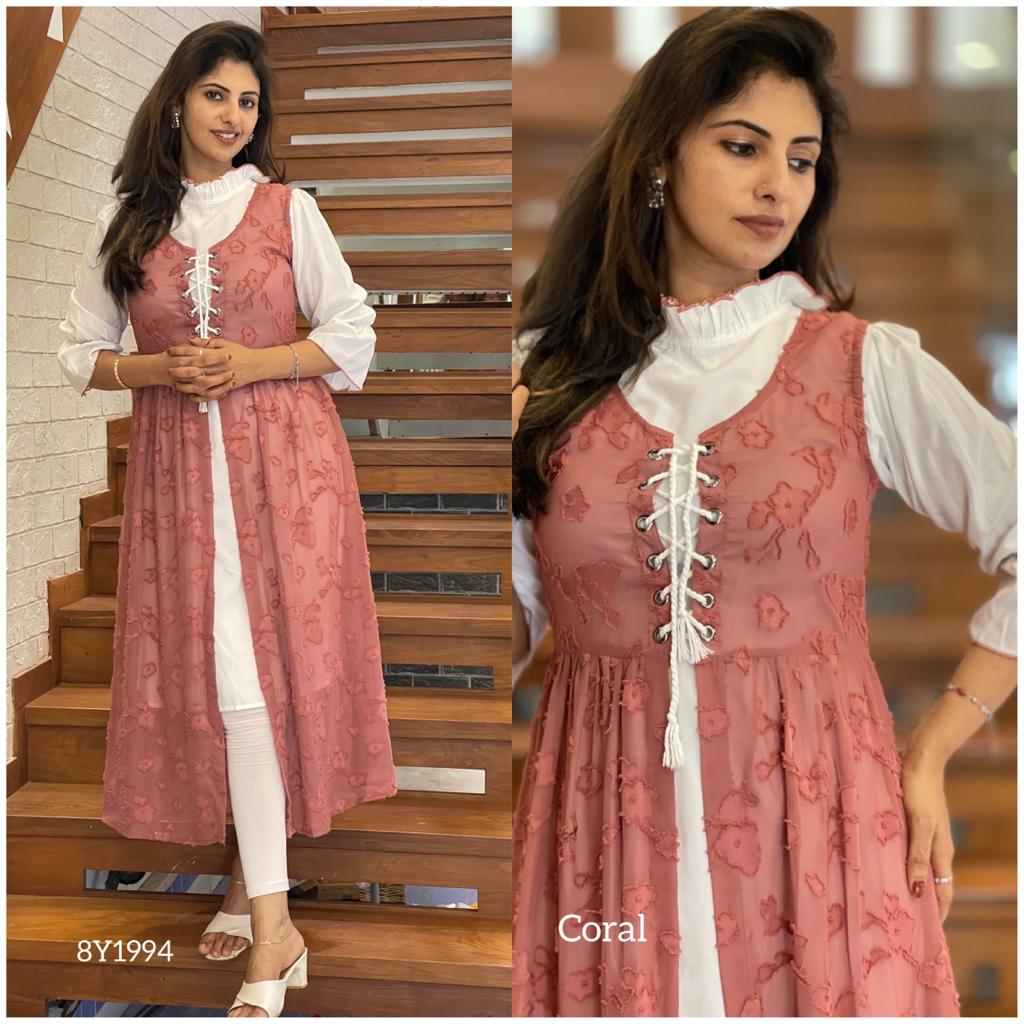 Imported Ajanta georgette kurti with elastic waist rib + separate thread pull embroidered diamond Georgette sleeveless jacket with York tie