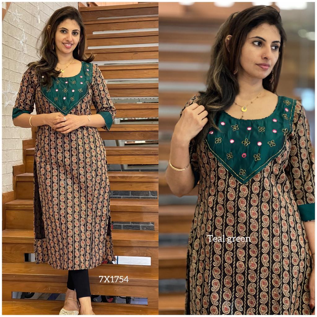 Cotton ajrak print slit kurti with cotton silk patch having piping n mirror work