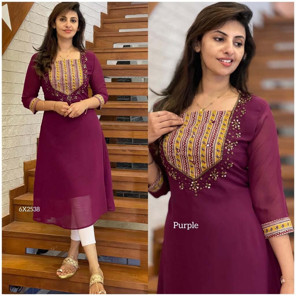 Faux georgette A line kurti with cotton ajrak print patch work having golden beeds n sequence work