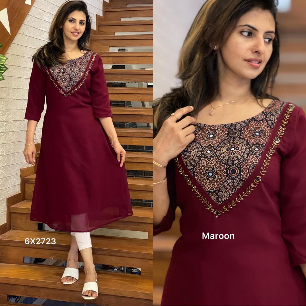 Faux georgette A line kurti with cotton ajrak print patch work having golden beads, piping n mirror work