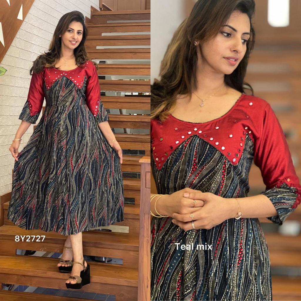 Rich rayon foil printed panel cut kurti with vichithra silk patchwork having mirror work