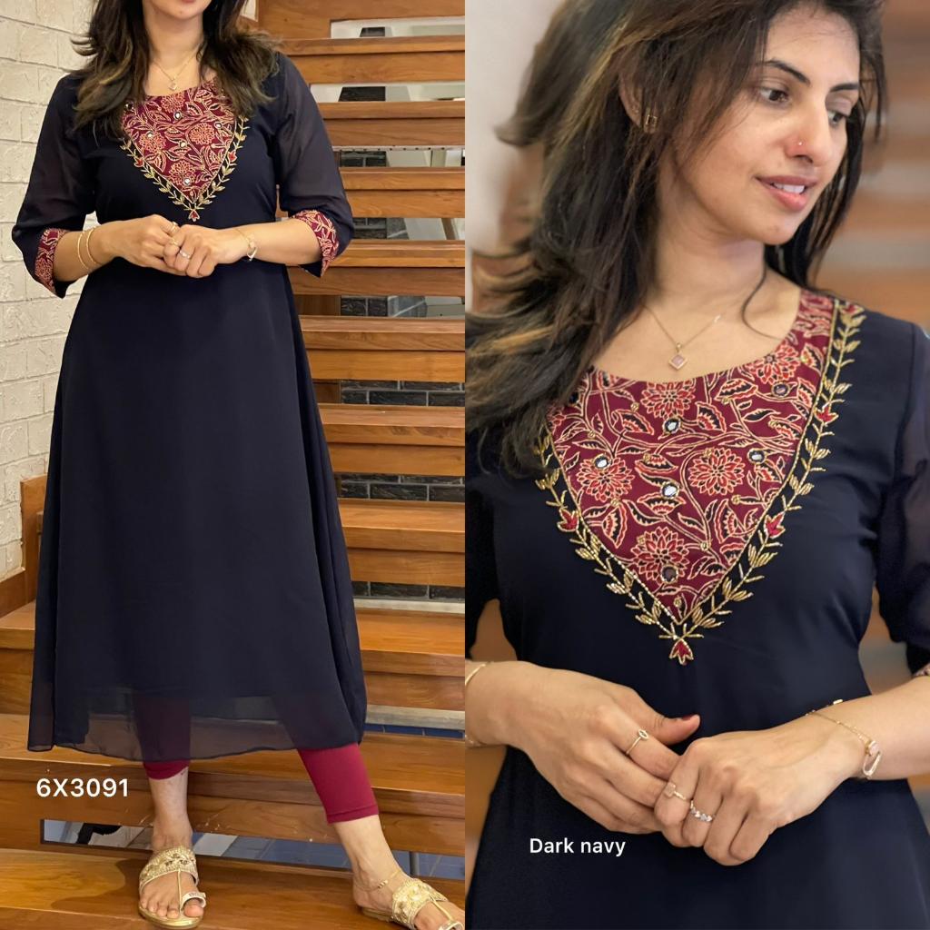 Faux georgette A line kurti with cotton ajrak print patch work having golden beads, piping n mirror work