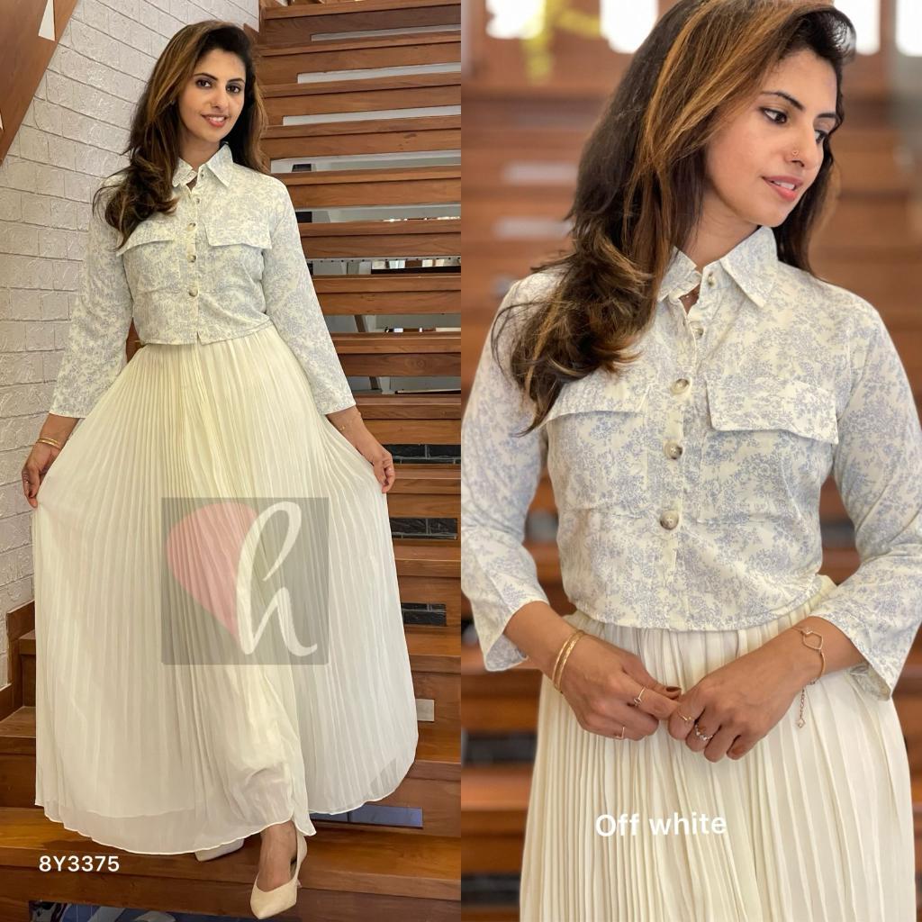 Faux Georgette self pleated skirt + poly Georgette printed crop shirt + rib Lycra banyan inner