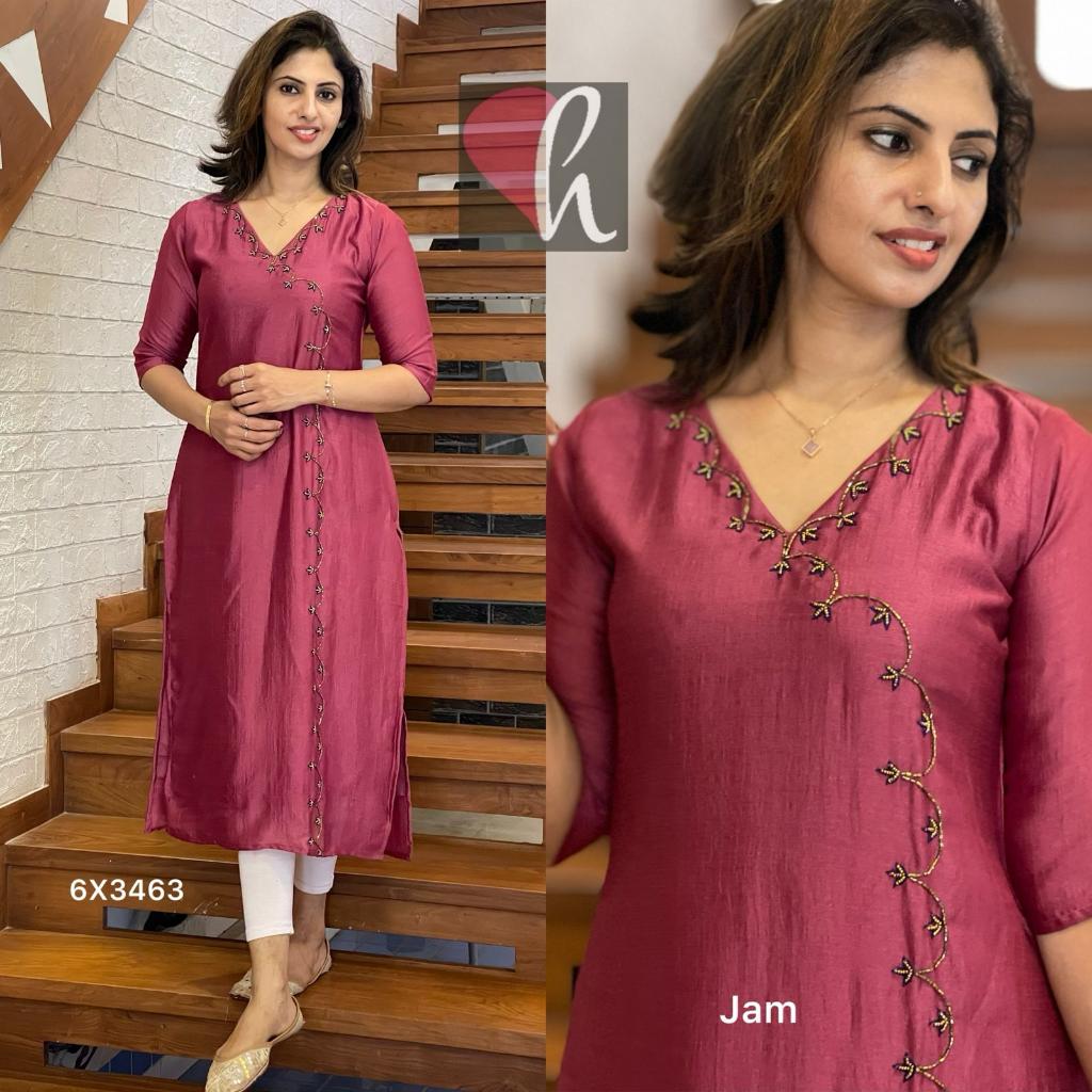 Vichithra silk slit kurti with Angrakha design piping , thread n beads handwork