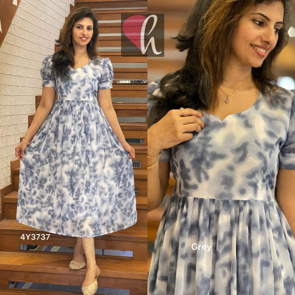 Size : M/L/XL/XXLLength : 46”Lining : YesPuff sleeves with cuffAdjustable back knot Flair kurti Pleated waist