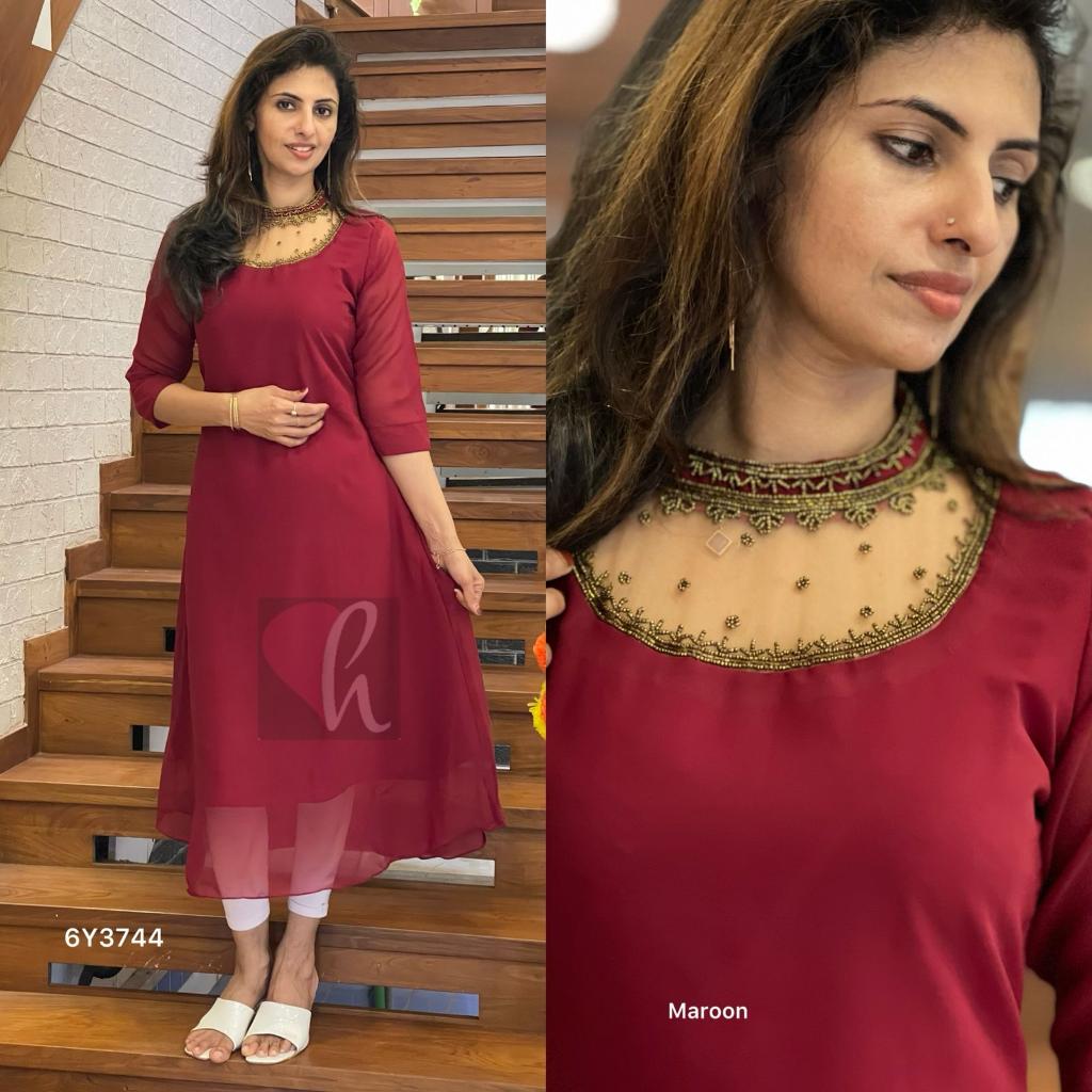 Size : M/L/XL/XXL Length : 47”Lining : YesHigh neck with back hidden zipHandwork with golden sugar pipe