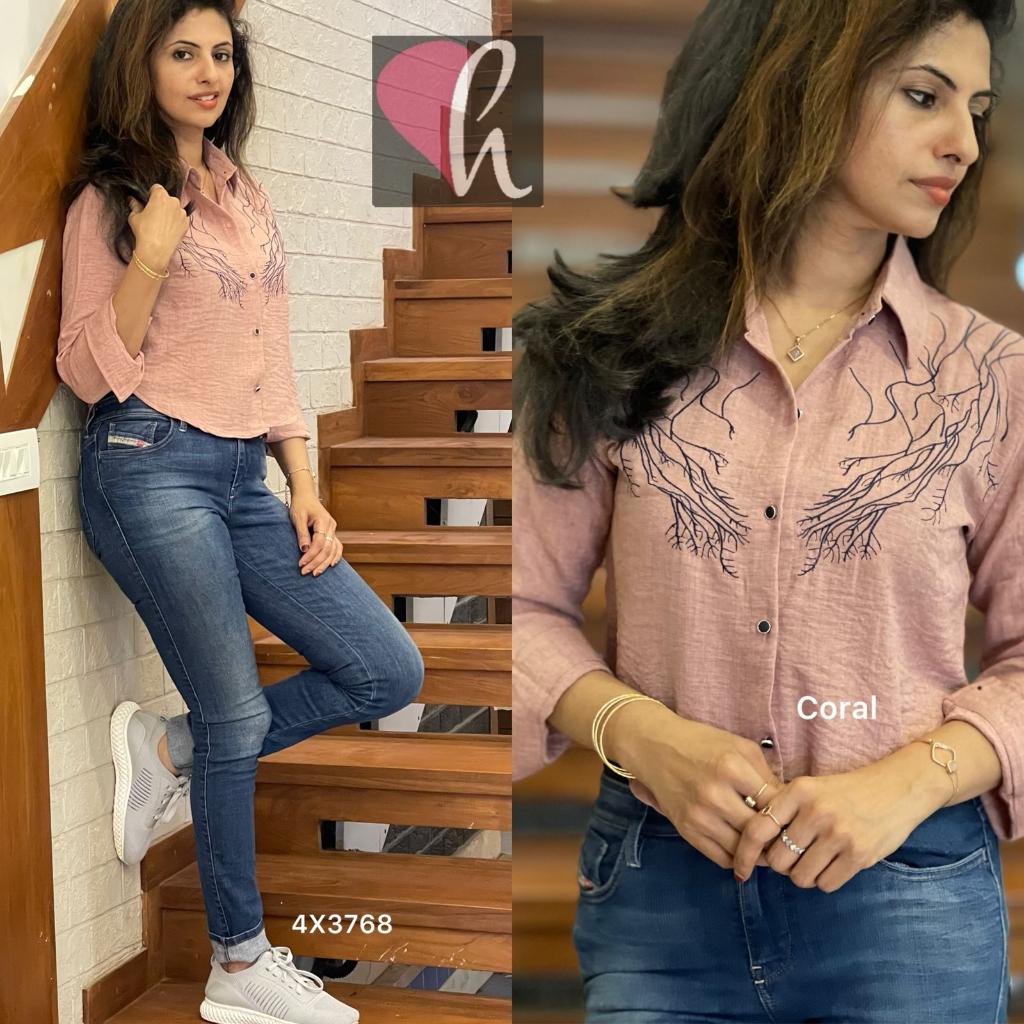 Cotton mix light poly denim Twill crop shirt with thread embroidery