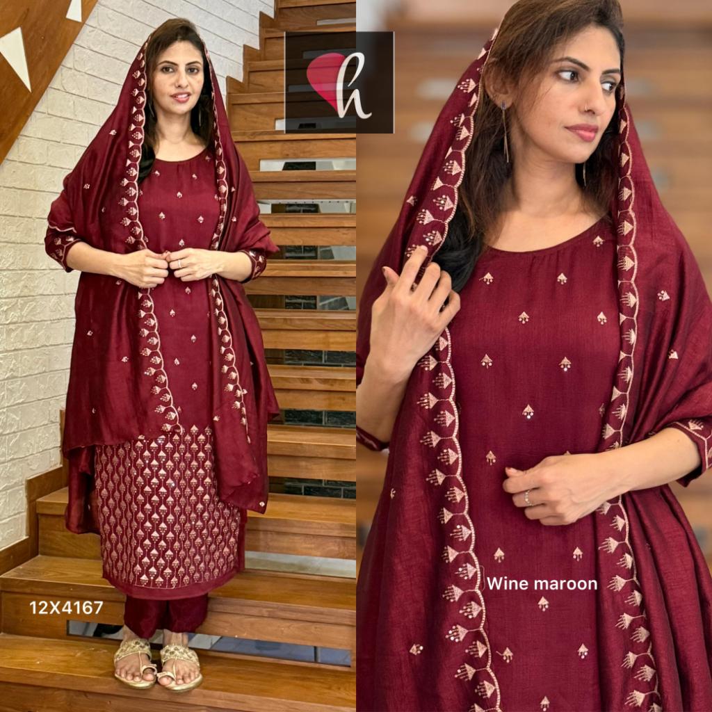 Vichithra silk slit kurti with heavy zari n sequins work + pant with lining + shawl